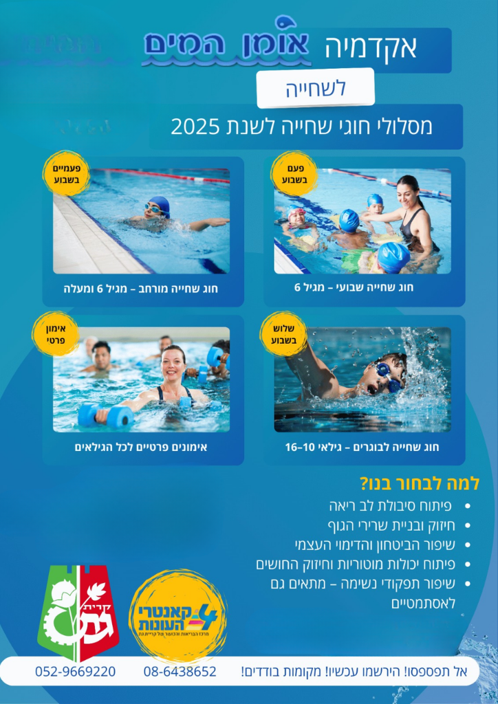 ביה"ס "אומן המים" למצילים קיים משנת 2000, ביה"ס מכשיר את התלמידים למצילי בריכה ולהתמחות בסגנונות שחייה שונים.