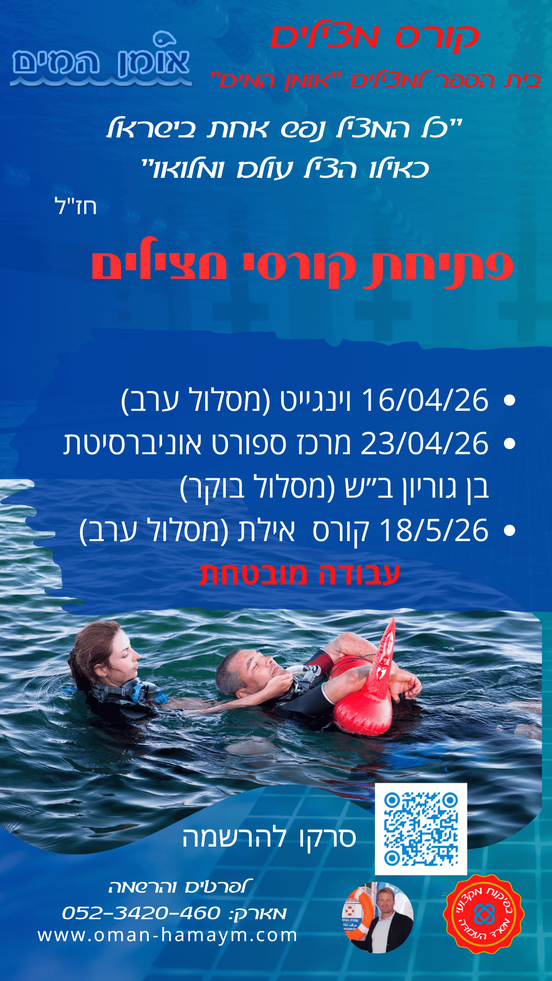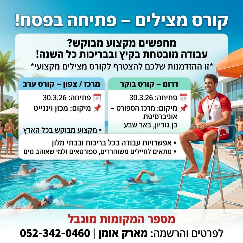 אם אתם מחפשים דרך להתחיל קריירה משמעותית במים — קורס מצילים ב"אומן המים" באשדוד הוא ההזדמנות שלכם. הקורס מעניק הכשרה מקצועית למצילי בריכה וים, עם